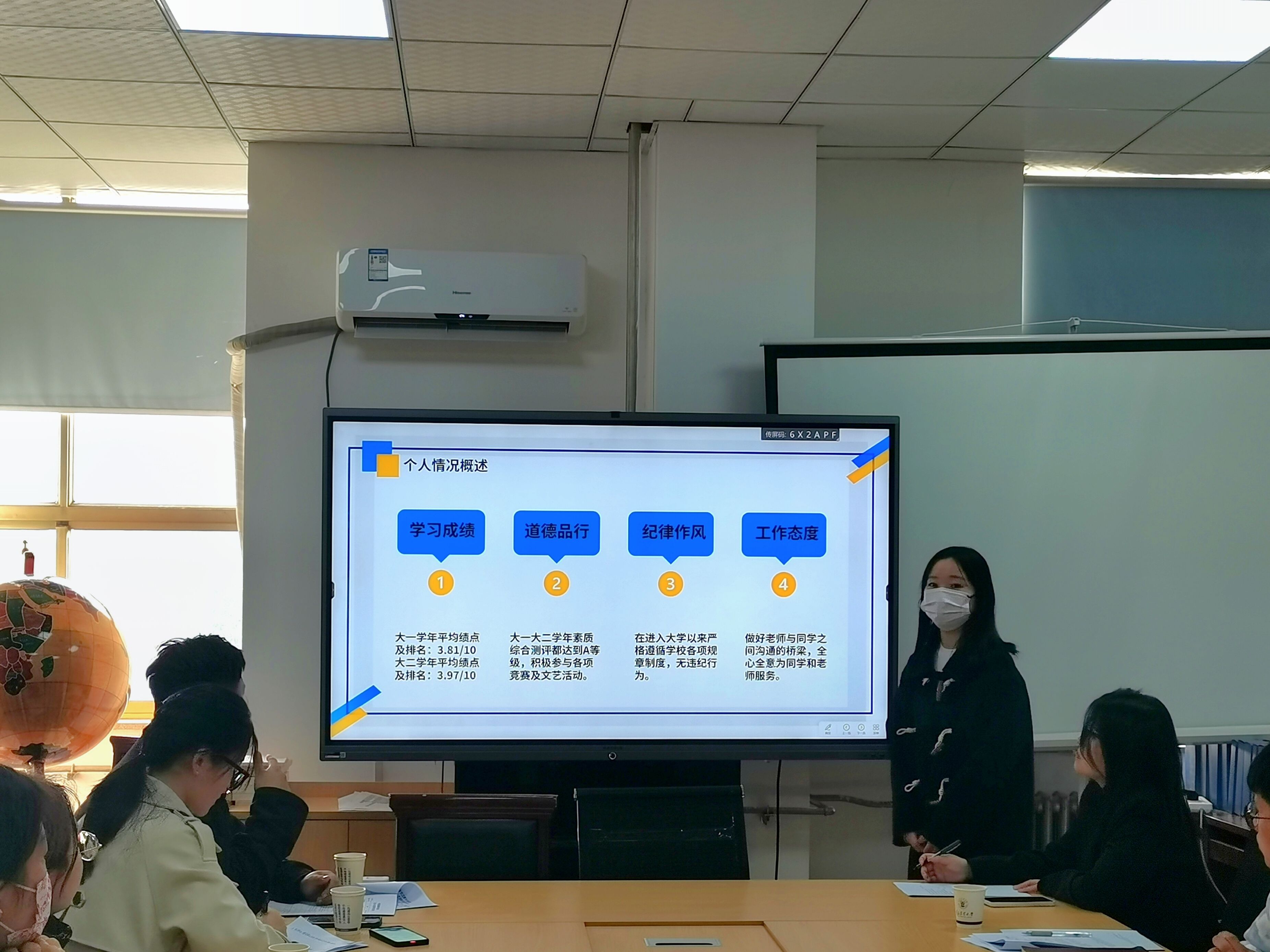 会上,学生会主席团成员和各部门部长分别进行工作述职,介绍了去年的工作完成情况及所取得的成绩,并就今后工作的开展方向做详细汇报。随后,各位评委根据学生会的述职情况进行打分并评价。最后,王洋老师对学生会各部门工作进行点评和总结,肯定之前同学们的努力,同时指出存在的一些问题,对今后的工作提出要求和展望。