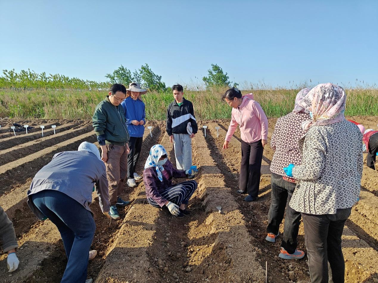 植物逆境生理与分子生物学科研团队多年从事作物耐盐机理研究和耐盐栽培技术研发工作,从盐碱地筛选了大量耐盐促生和耐盐拮抗有益菌株,并研发了耐盐促生多功能生物菌肥,在作物和蔬菜上应用,效果显著。团队介绍了耐盐多功能肥料的特性、以往开展的实验效果,对肥料施用流程及标准、施用后注意事项、水肥管理、病虫害防治及日常管理注意事项等进行详细讲解,并做示范。强调了微生物菌肥施用注意事项,田间日常管理,做好跟踪服务和调研,定期检查土壤盐碱度、理化性质和微生态变化,统计不同处理的作物长势,生物学性状、农艺性状和病虫害等情况,保留好影像资料,为进一步推广应用提供数据和资料。