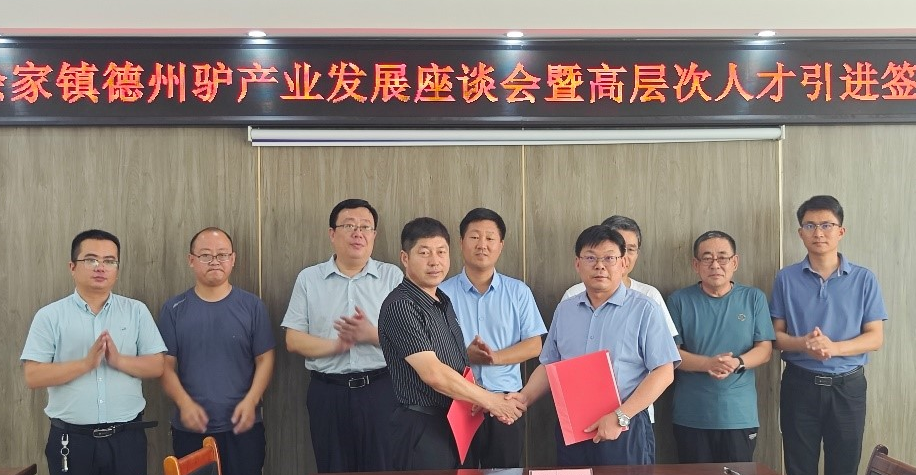 7月11日上午,沈伟教授、孙玉江教授和张西锋教授在国家级德州驴保种场、山东俊驰驴业有限公司进行了参观考察,并参加了德州驴产业发展座谈会,详细了解德州驴种质资源保护和评价、品种选育、饲养管理和生产经济效益等情况,并就产业发展中存在的问题、生产中面临的困难进行了现场指导。座谈会结束后,沈伟教授与山东俊驰驴业有限公司签署了高层次人才引进协议,无棣县副县长李斌、县畜牧局局长王者勇、镇党委书记孟维峤、佘家镇镇长张学冰等人出席了签约仪式。