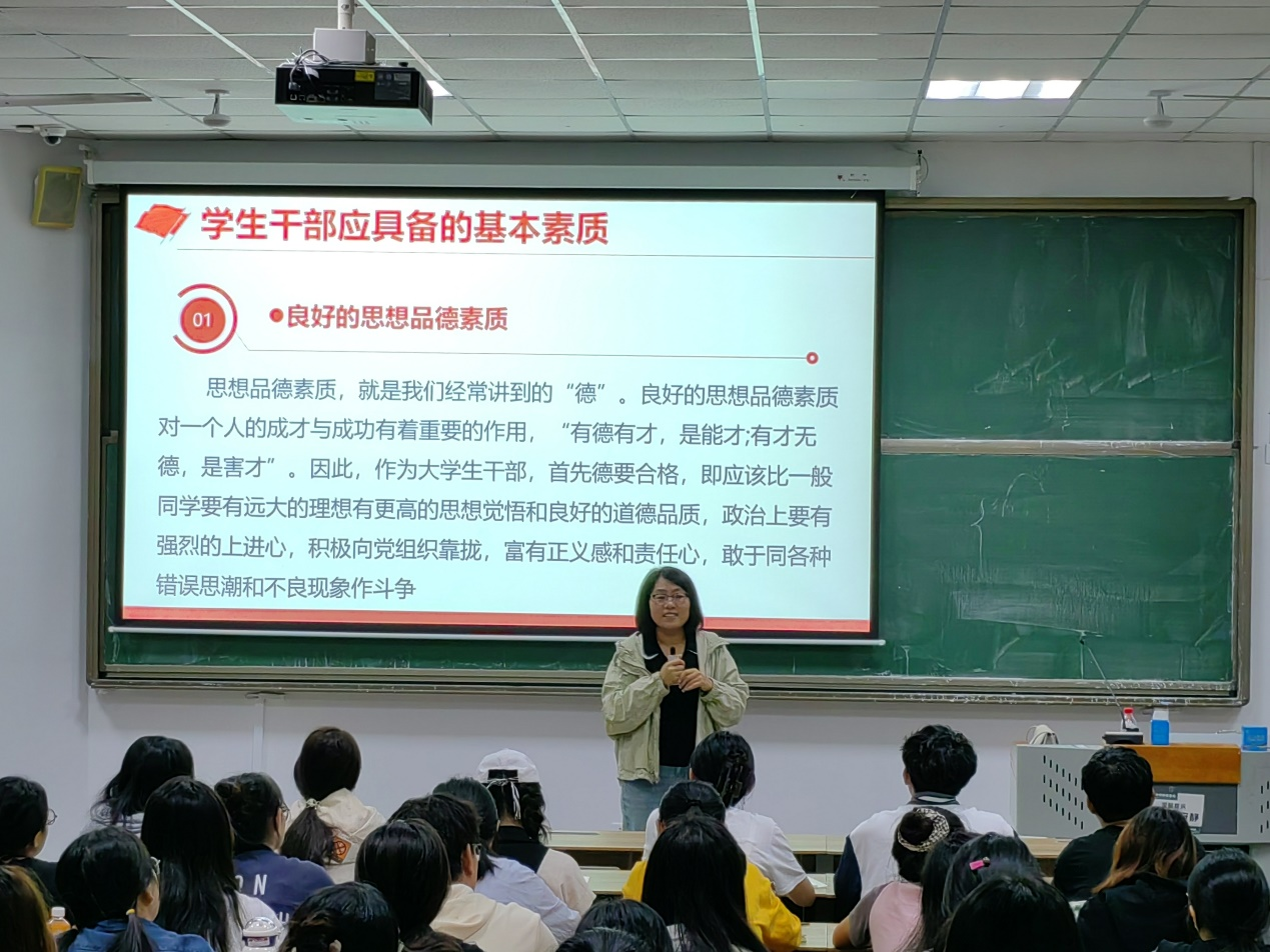 会上,王洋作了题为《笃行实干,立身立行——如何做一名优秀的学生干部》的报告,分别从什么是学生干部、学生干部如何做、学生干部的优势三大方面展开讲解。王洋指出,作为学生干部应该在学习、工作、道德等方面严格要求自己,要有良好的思想品德素质、语言沟通能力、组织协调能力、领导能力和创新思维,要具备强烈的责任感和使命感,对工作质量负责。她还强调,学生干部应当具备专业技能,熟练使用办公软件和计算机硬件,学会独立思考、善于总结,提高个人的核心竞争力。